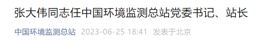 6月25日,据中国环境监测总站消息,根据部党组《关于张大伟、刘廷良同志职务任免的通知》(环党组〔2023〕60号),张大伟同志任中国环境监测总站党委书记、站长。